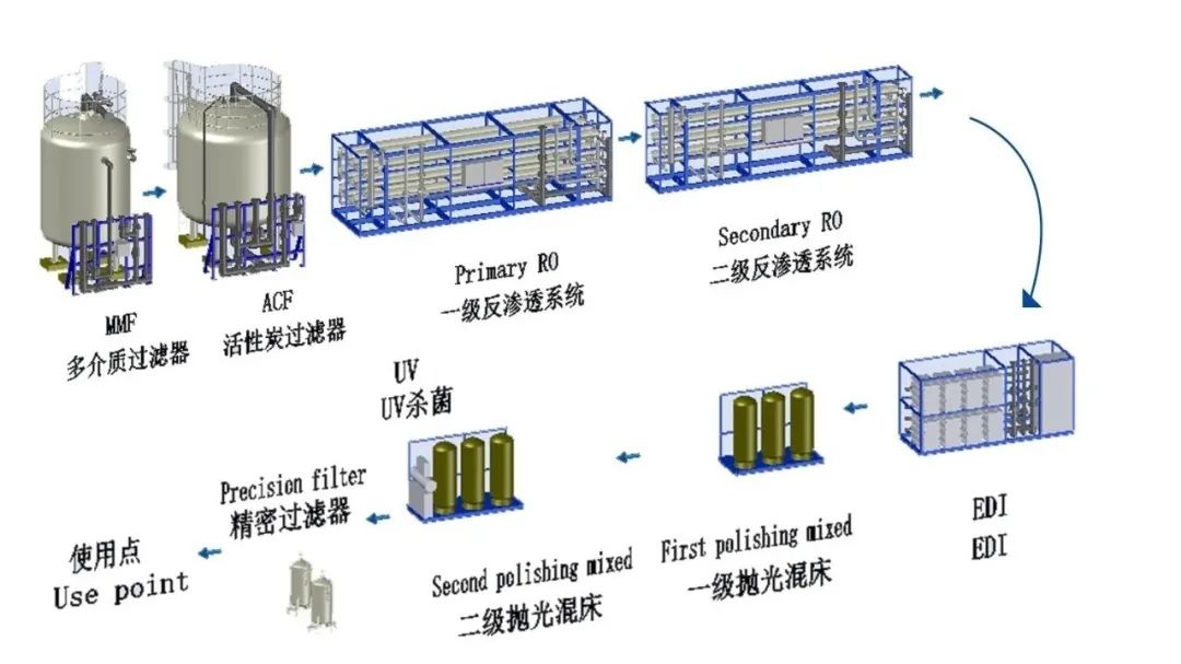 EDI系统由增压泵、膜堆、电源以及相应的仪器、仪表、阀门、机架、管道等组成。